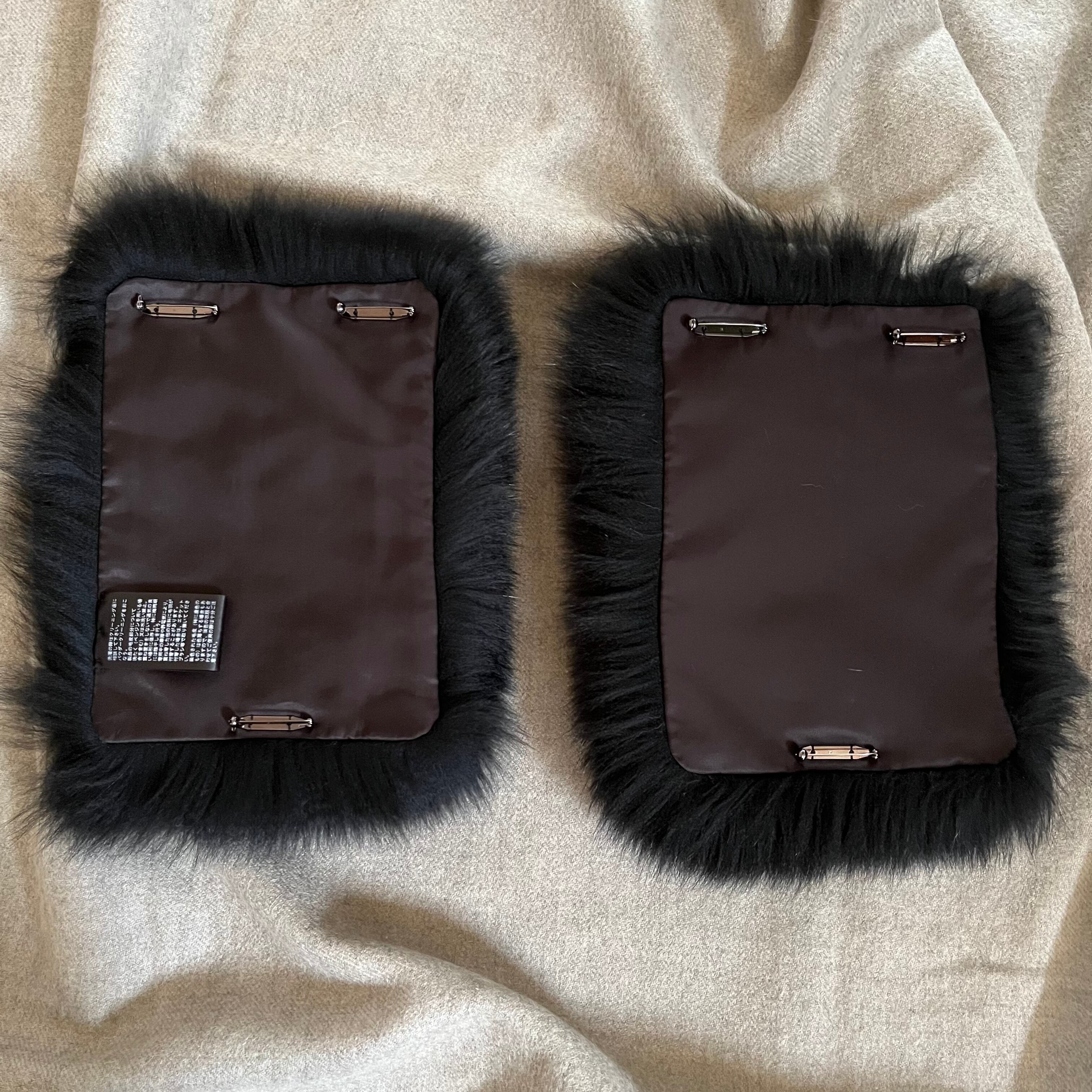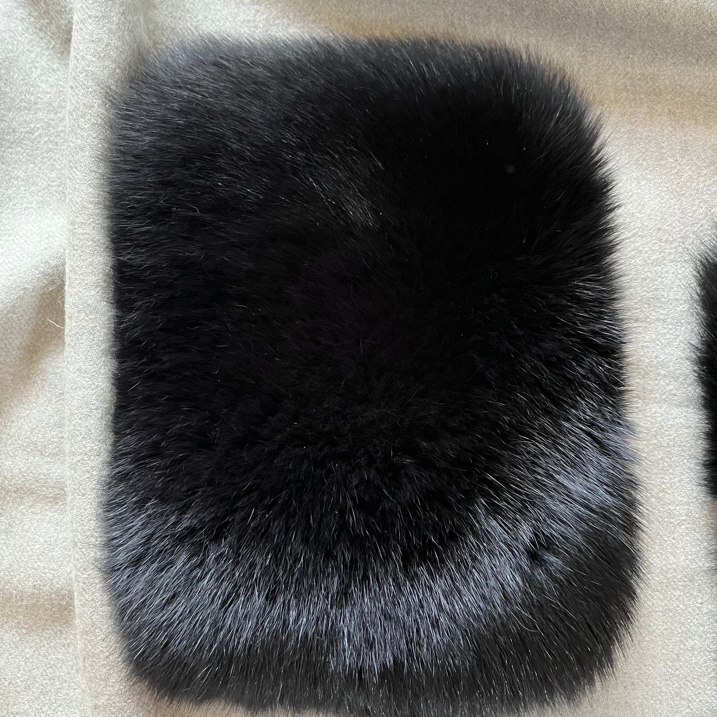 最高級シルバーフォックスの飾りポケット 2個のセットです。お手持ちのジャケットやコートなどに着けるだけで、いつものアイテムがグレードアップ! エレガントな印象が加わって、お洒落の幅が広がります(ファッションアイテムなので手や物を入れる事はできません)。艶のあるブラックなので、黒はもちろん、ネイビーやグレーなど、様々な色の幅広いアイテムと相性抜群です。コートの身頃には飾りポケットとして、また袖口に着ければゴージャスな袖飾りとなり、着ける場所によって様々な表情でエレガントな装いを演出してくれます。