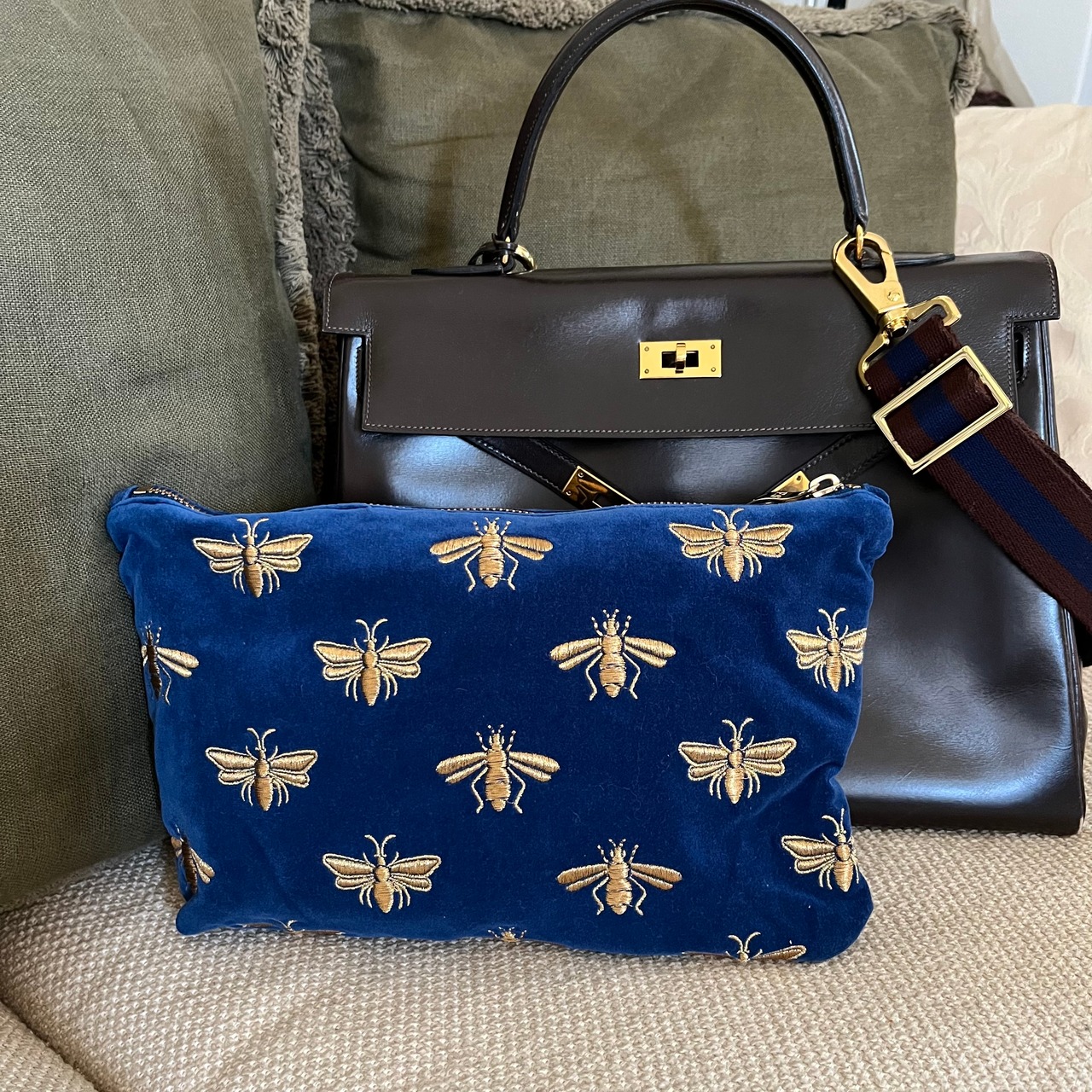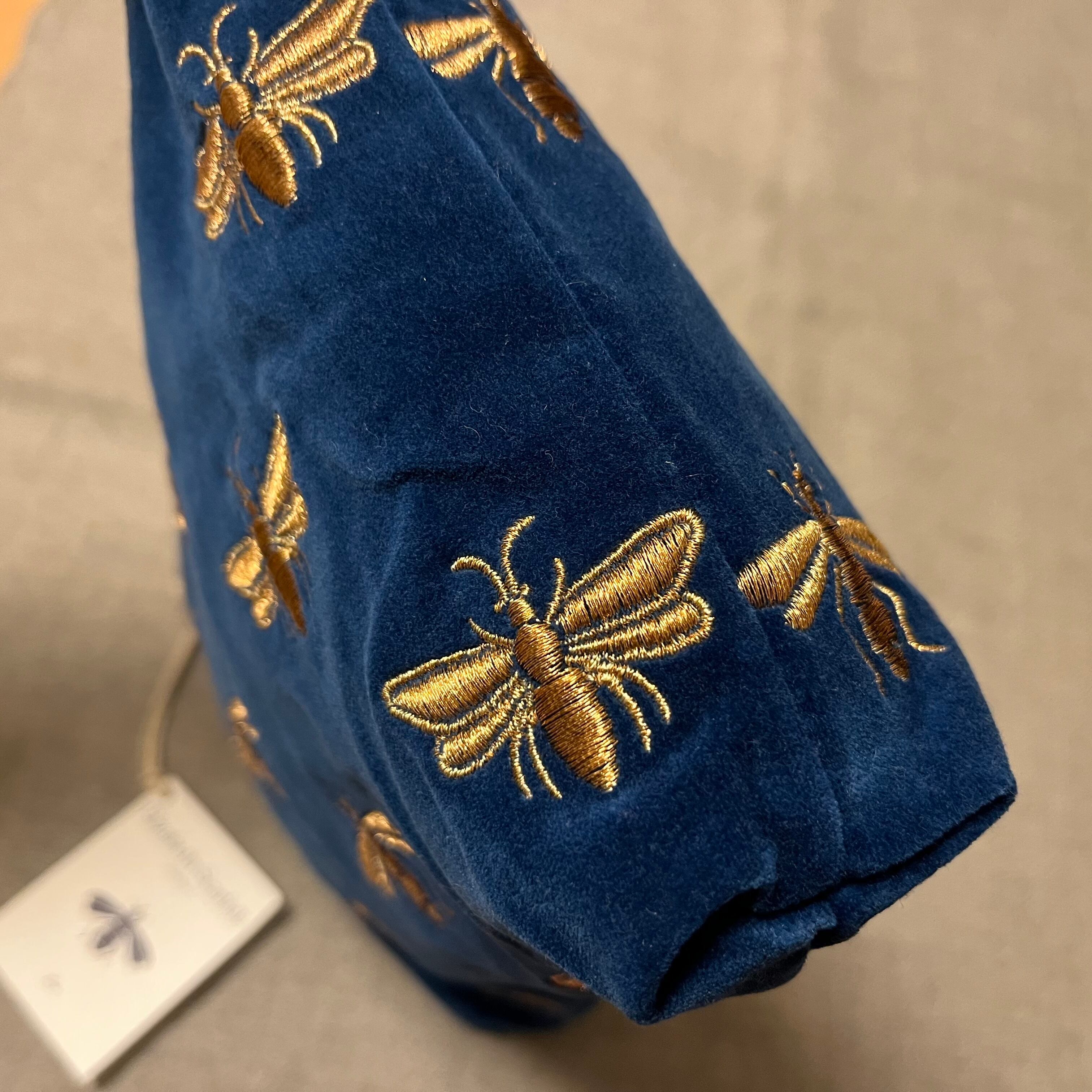 ヨーロッパでは古くから幸せを運ぶと言われてきた蜂。ゴールドの蜜蜂をベルベットに施しつつ、柔らかいコットン素材を選ぶことで、カジュアルなイメージに落とし込んでいます。