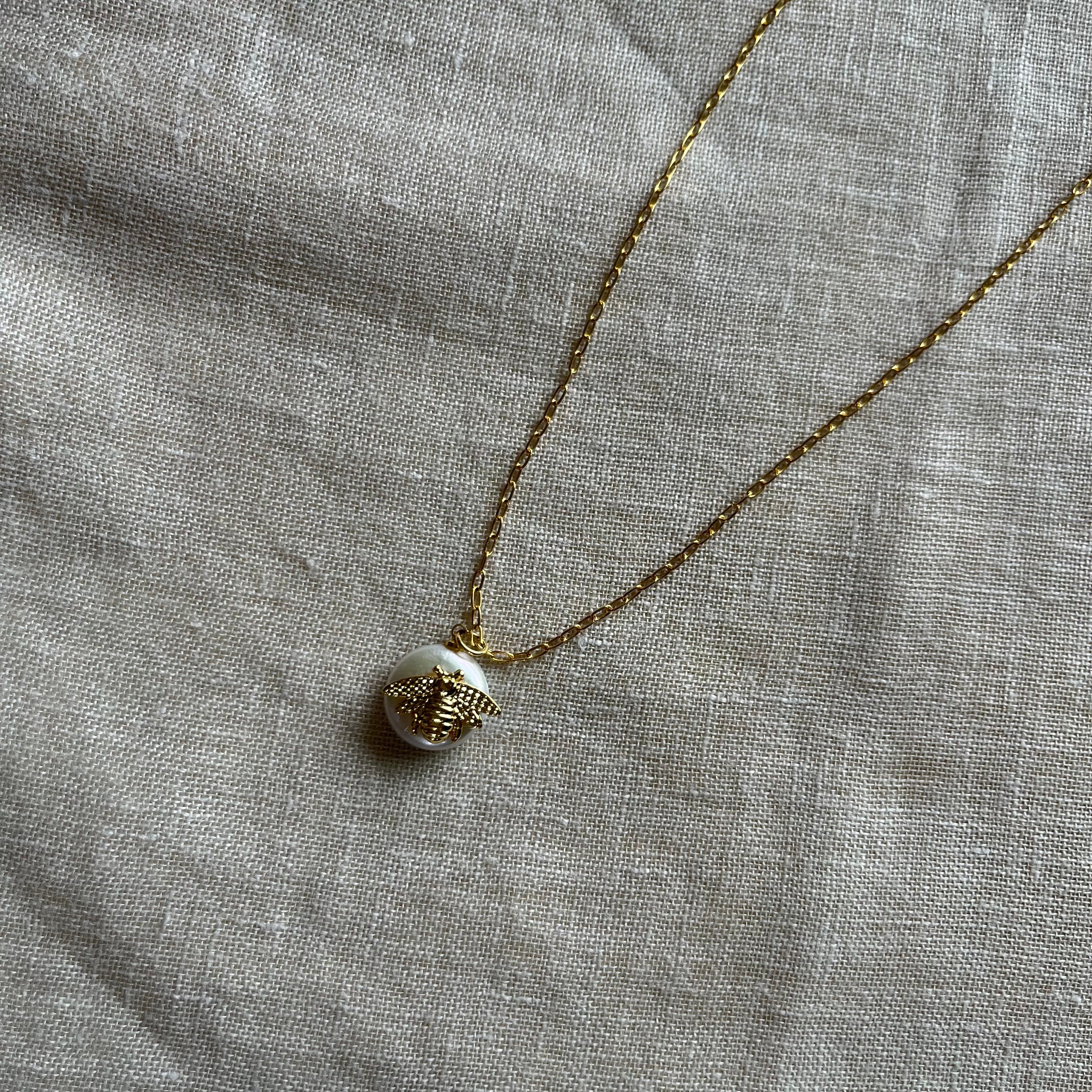 今回お届けするのは、淡水パールにゴールドのミツバチを乗せた、女性らしさの中にキッチュな遊び心を取り入れた逸品。シンプルな秋のシャツに、ふんわりニットに、単体でも 他のネックレスとの重ね付けでも素敵です。