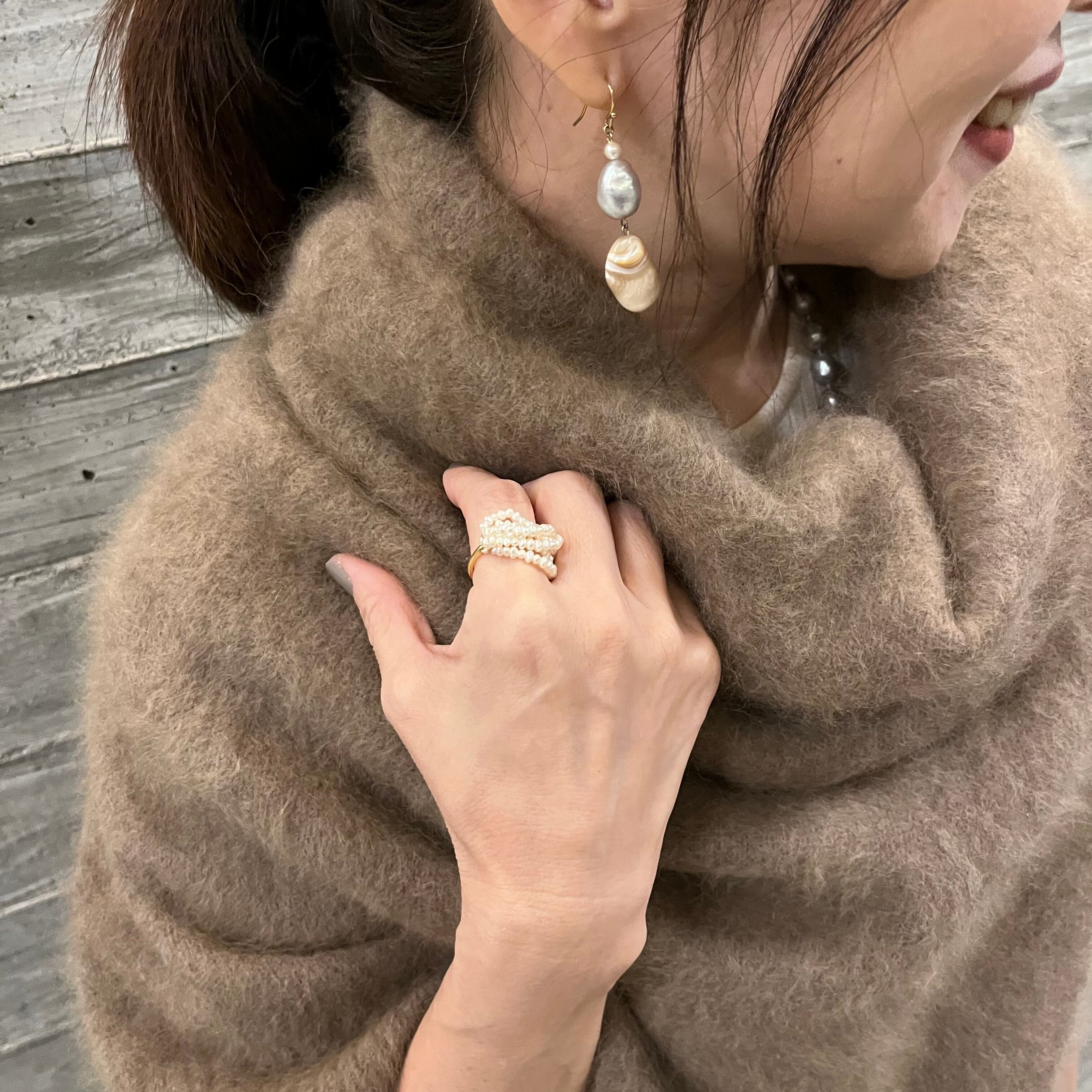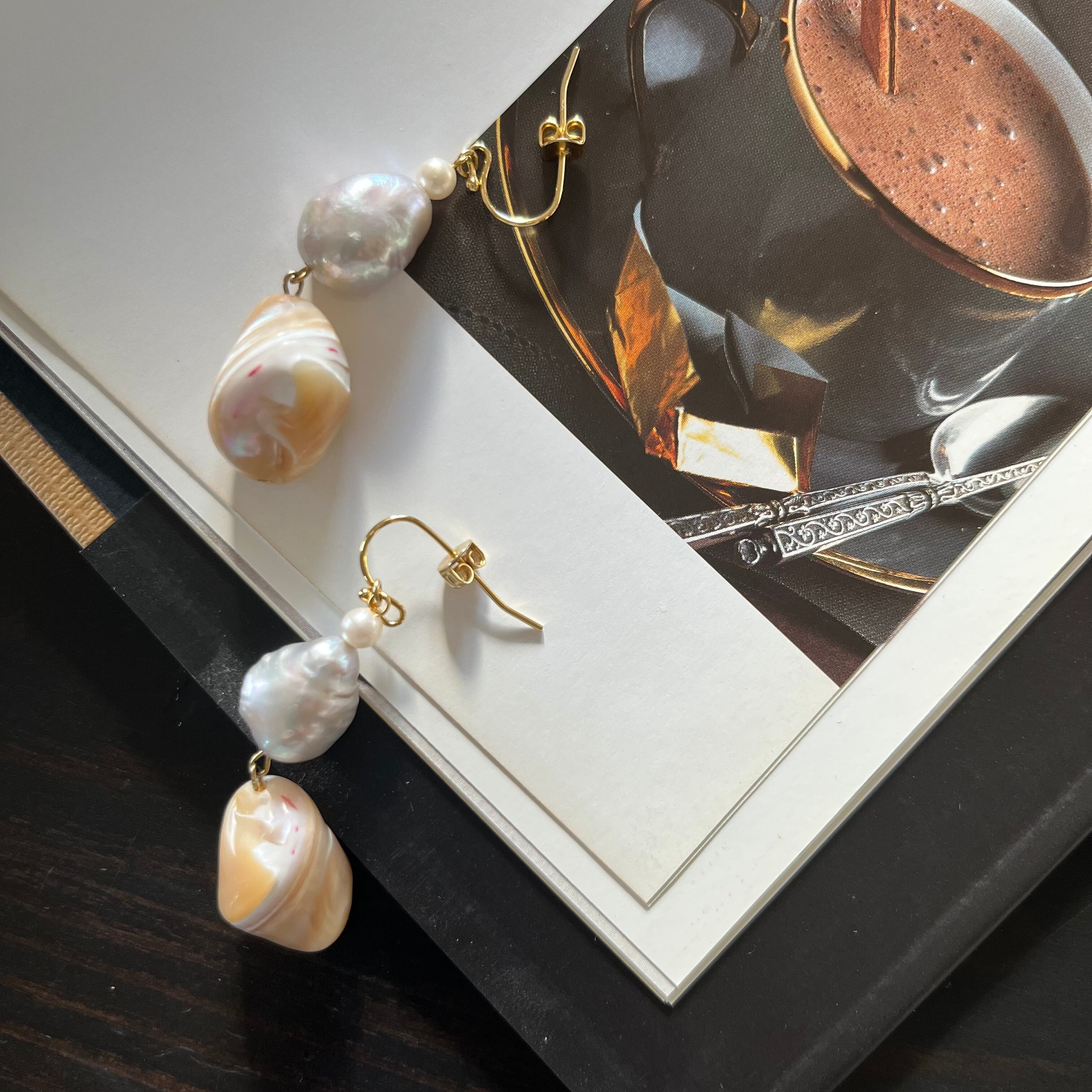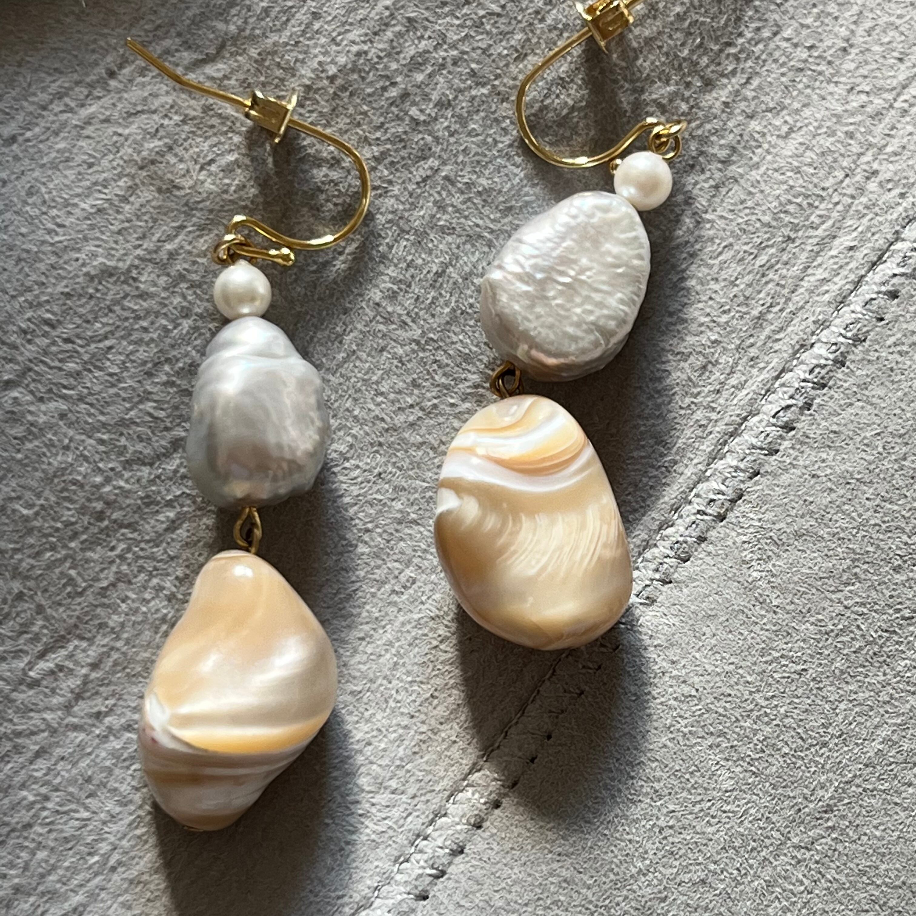 今回のbracetiqueオリジナルピアスは、マレ地区で購入した、ベージュのマザーオブパールをカフェノワゼットに見立てて。ベージュやグレーの装いに馴染みながらも、気品ある大人の華やかさをプラスしてくれるピアスです。